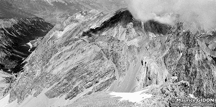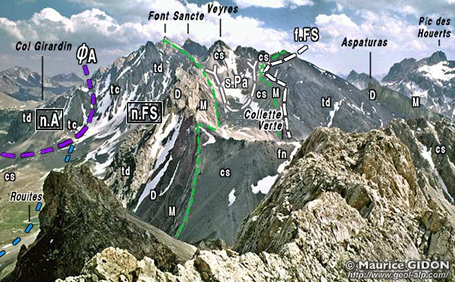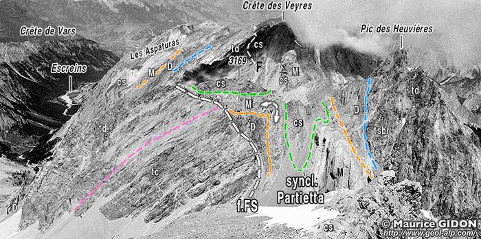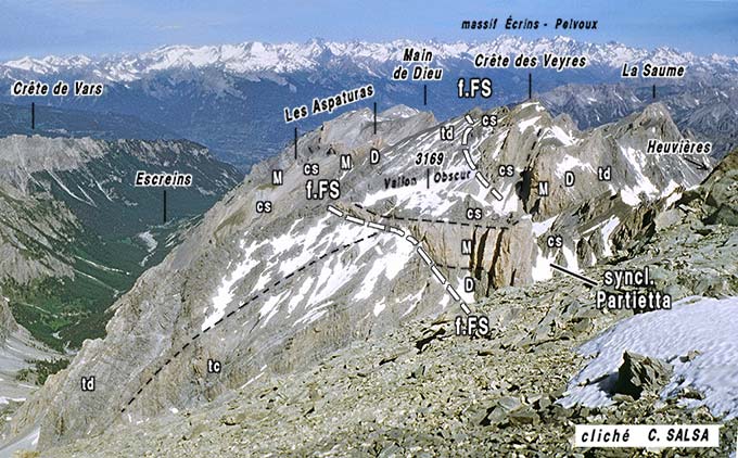 ![]() Même vue, prise depuis un point situé un peu en contrebas nord-ouest sur l'arête sommitale (cliché original obligeamment communiqué par Mr C. SALSA). Les abrupts inférieurs de la rive nord du vallon de la Font-Sancte sont masqués par les calcschistes du Crétacé supérieur du coeur du synclinal de la Partietta, qui affleurent en premier plan. En dépit de la prise de vue en couleurs les plans successifs se confondent. C'est ainsi que la crête des Aspaturas, dont deux pointes sont désignées par des tirets noirs, se profile devant la crête de la Main de Dieu - Pic d'Escreins - Dent de Rocher (dont elle est séparée par le Vallon Claous). C'est aussi pourquoi le tracé de la faille de la Font-Sancte (f.FS) est représenté par deux tronçons décalés : ils sont séparés par la profonde entaille du Vallon Obscur, dans laquelle le tracé de la cassure décrit un redent fortement rentrant vers la droite. |