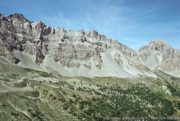 Du côté nord-oriental cette arête tombe brutalement sur les pentes des Rouites et (plus bas) du lac des Prés Sébeyrands. Ce haut abrupt, orienté sensiblement comme les couches (qui pendent vers l'intérieur de la montagne) donne une coupe presque totale de la succession stratigraphique de la nappe de la Font-Sancte. Le talus qui garnit son pied masque de façon preque continue la base de cette succession, mais il laisse cependant pointer un assez large affleurement de gypses qui représente sans doute un témoin du coussinet sur lequel s'est effectué le glissement de la tranche de roches que constitue cette nappe.
