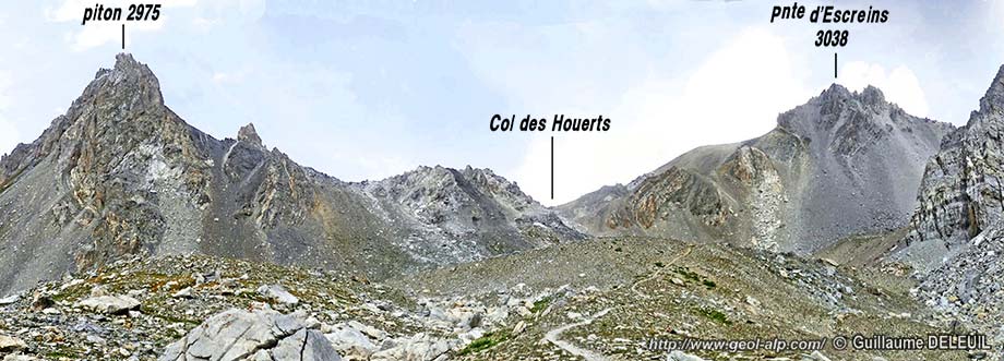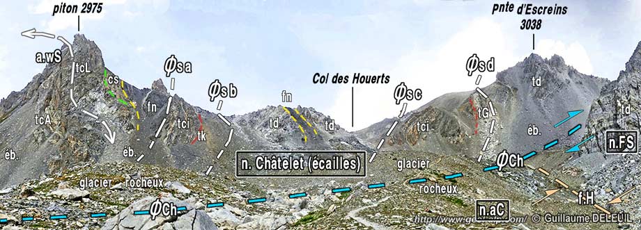 En effet, à l'ouest de la Pointe d'Escreins, sur la crête du col des Houerts, le matériel rapporté à la nappe du Châtelet se montre affecté par les écailles du col des Houerts : il s'agit d'un système tectonique où des cargneules et des calcaires triasiques appartenant à la base de la nappe du Châtelet s'intriquent avec des lames de marbres en plaquettes et de flysch noir par l'intermédiaire de cassures à pendage très redressé plutôt pentées vers l'ouest qui coupent la crête presque orthogonalement.