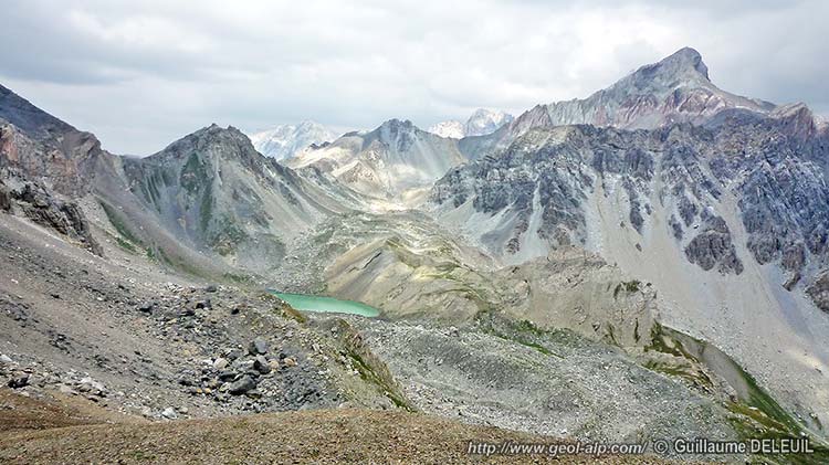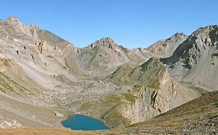 2/ La partie haute du versant, au nord des Becs de La Grand Roche et du col du Pont, est creusée par une dépression NW-SE ouverte dans les calcschistes de la nappe des Aiguilles de Chambeyron. Elle héberge l'alignement des Lac Bleu et Lac Vert, qui sont isolés l'un de l'autre par un bourrelet pseudo-morainique du glacier rocheux qui colmate le plus creux du vallon.
