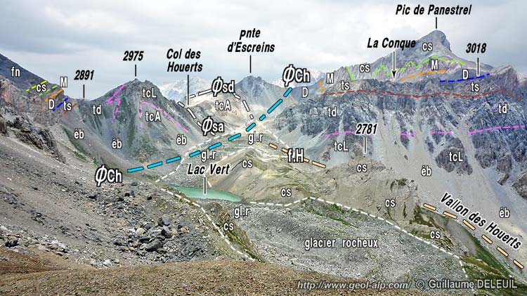 On peut donc envisager que la fragmentation et les imbrications de ce panneau oriental de la nappe du Châtelet qui est conservé sur la crête du Col des Houerts s'explique par l'écrasement qu'il a pu subir à l'occasion de ce "rétro-charriage". Mais une autre interprétation également plausible est que les fractures qui imbriquent ces écailles sont les prolongements vers le haut de celles qui affectent le soubassement tectonique de ces écailles, c'est-à-dire la nappe de Chambeyron, à la latitude des lacs de Houerts. La jupe d'éboulis qui suit le pied méridional de la crête des Houerts et le glacier rocheux qui s'étale en contrebas rompent malheureusement la continuité verticale des affleurements ce qui empêche de savoir si cette connexion est réelle.