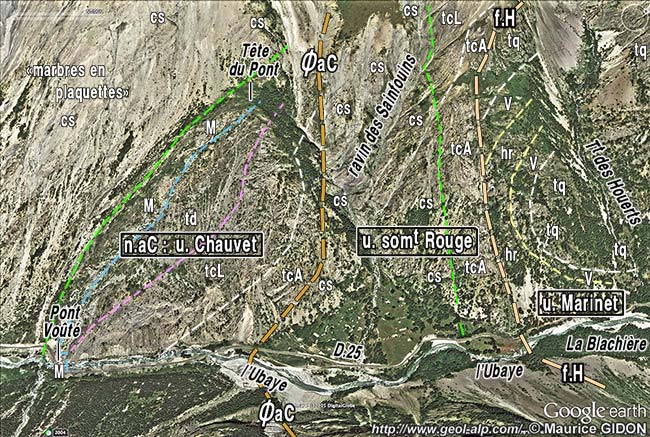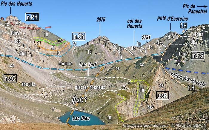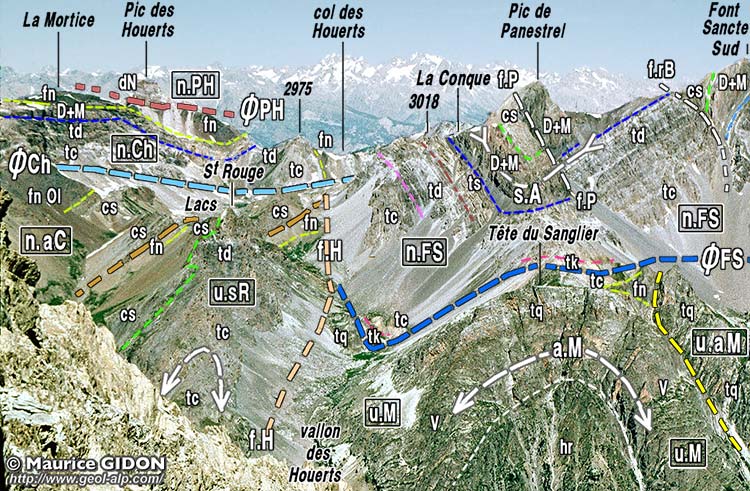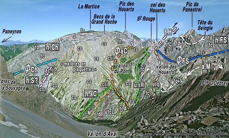 vue du sud-est, depuis le Pas de la Souvagea. Le fond de la vallée de l'Ubaye n'est pas visible, masqué par le replat boisé coté 2199 du bas vallon d'Aval (pour plus de clarté la partie du paysage située en rive gauche de l'Ubaye a été couverte d'un voile grisé). n.Ch = nappe du Châtelet ; n.S = nappe de Sautron (l'attribution de la masse des marbres en plaquettes de la Grand Roche à cette nappe reste une interprétation hypothétique) ; ac.i? = accident de l'Infernetto ? ; n.aC = nappe de l'Aiguille de Chambeyron, digitation de Chauvet (corps principal de la nappe : ØaC = sa surface de chevauchement) ; u.sR = digitation du Sommet Rouge) ; n.FS = nappe de la Font-Sancte ; a.M = anticlinal de Marinet (affectant ici l'unité inférieure de Marinet). f.H = faille des Houerts : noter les rebroussements affectant les couches de ses deux lèvres, qui témoignent du sens de mouvement. Crétacé supérieur - Éocène : csn = calcschistes supérieurs argileux noirs ; cs = calcschistes très calcaires (faciès "marbres en plaquettes") ; csi = calcschistes inférieurs à rubanements plus colorés. |