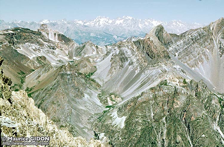 Symétriquement par rapport à la crête du col des Houerts, dans le vallon d'Escreins, on voit affleurer dans la même situation les calcschistes de l'unité inférieure du Guil, laquelle s'avère, de ce fait, constituer le prolongement septentrional probable de la nappe des Aiguilles de Chambeyron (voir la page "Haut Rif Bel"). |