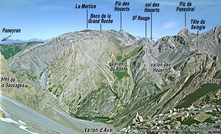 1/ La crête et les abrupts de la Grand Roche, jusqu'au niveau de l'Ubaye ne sont pratiquement constitués que par cet ensemble de couches. Mais son apparente homogénéité est certainement très illusoire car on y observe des intercalations étrangères qui ne peuvent guère s'expliquer que par la présence de contacts tectoniques internes. Il s'agit de passées de schistes noirs s'apparentant au "flysch noir", comme celle de la rive gauche du ravin du Grand Caire ainsi que de panneaux hectométriques de calcaires triasiques et de Jurassique supérieur, dans les pentes orientales du col du Grand Caire, au sud-ouest du Lac bleu des Houerts.