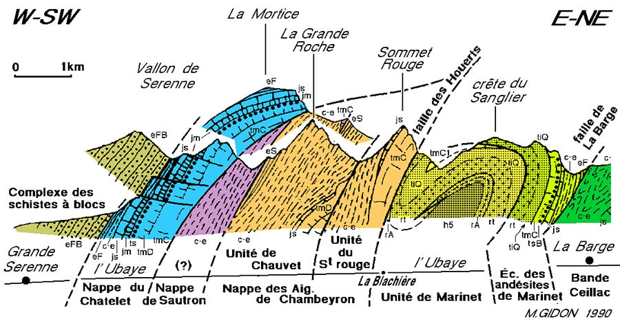 | Coupe de la rive droite des gorges de l'Ubaye, entre Grande Serenne et La Barge. La légende stratigraphique est celle de la carte géologique Aiguille-de-Chambeyron au 1/50.000°. Les couleurs, qui permettent de distinguer les unités tectoniques, sont celles du schéma d'interprétation rétro-tectonique. |