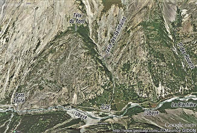 En fond de vallée les affleurements de marbres en plaquettes du soubassement des Becs de la Grand Roche se poursuivent sur plus de 1 km, jusqu'au Pont-Voûté. Là on les voit reposer, en contact stratigraphique, sur les marbres du Malm qui garnissent le versant ouest de l'échine rocheuse de la Tête du Pont. Cette dernière est constituée par les termes calcaires inférieurs jurassiques et triasiques de la nappe des Aiguilles de Chambeyron, laquelle y est d'ailleurs bien reconnaissable par sa succession stratigraphique (Malm discordant sur le Trias moyen).