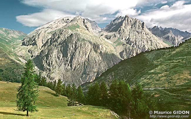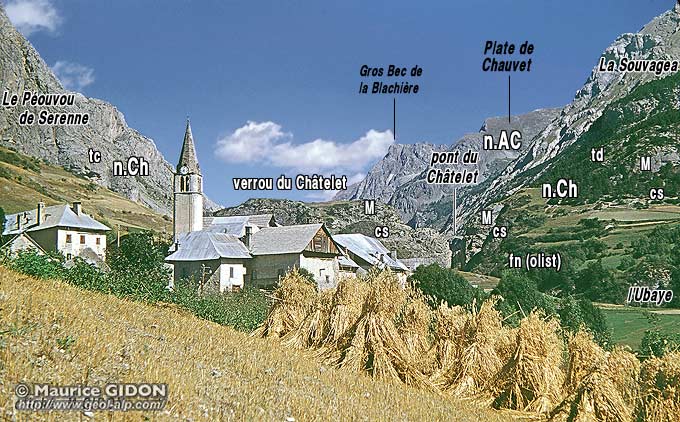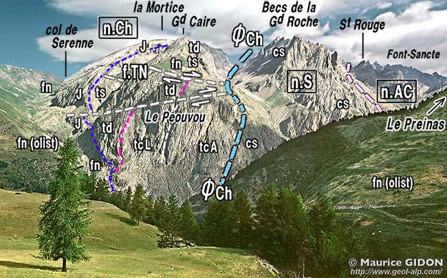La rive droite du vallon de Fouillouse forme les pentes d'avant-plan droit (envahies par l'ombre). Leurs ravins sont entaillés dans l'olistostrome à matrice de flysch noir "fn(olist)" du sommet de la succession de la nappe du Châtelet. n.Ch = nappe du Châtelet ; n.S = nappe de Sautron (l'attribution de la masse des marbres en plaquettes de la Grand Roche à cette nappe reste hypothétique) ; n.AC = nappe de l'Aiguille de Chambeyron. Voir à la fin de la page la coupe interprétative des détails de la nappe du Châtelet et ceux concernant la partie haute de la montagne aux pages "Mortice" et "Becs de la Grand Roche". |