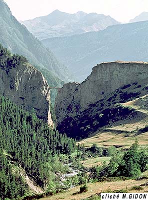De part et d'autre du pont, la barre calcaire s'élève dans le versant en se renforçant du côté nord-est par adjonction des dolomies et des calcaires du Trias moyen. L'épaisse barre rocheuse presque verticale y arme deux épaules rocheuses symétriques, au nord celle du Péouvou et au sud celle du Preina. L'une et l'autre se terminent par un replat situé respectivement vers l'altitude de 2300 et de 2000 m. Cette différence d'altitude montre que leur origine n'est pas un simple épaulement glaciaire : effectivement ces replats correspondent en fait à la présence de failles plates qui décalent le panneau supérieur vers le NE en ramenant ainsi le flysch noir sur la tranche des bancs du Jurassique.