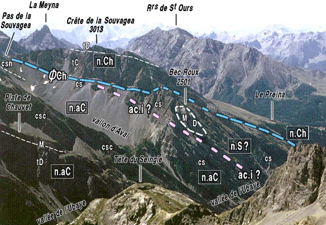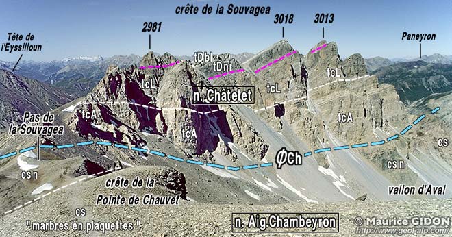 En fait l'individualisation de cette crête vient de ce qu'elle est armée par la terminaison sud-orientale des affleurements calcaires triasico-jurassiques de la Nappe du Châtelet proprement dite, surtout représentés en rive NW de l'Ubaye (La Mortice), lesquels s'intercalent entre deux bordures de matériel moins résistant à l'érosion, argilo-gréseux au SW (Fouillouse) et argilo-calcaire au NE (Lacs de Chambeyron).