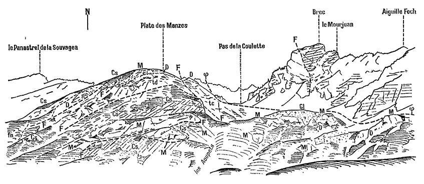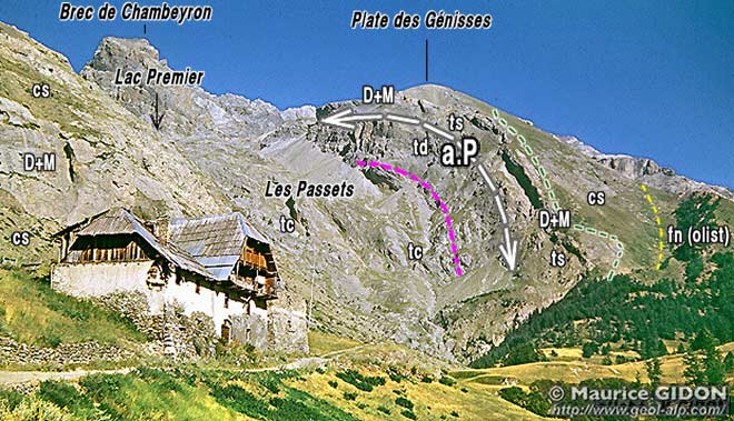 Au sud du Replat des Génisses (= Plate des Manzes des anciens documents) le Jurassique de la voûte anticlinale n'affleure plus que occasionnellement sous les marbres en plaquettes , à la faveur de cassures transverses. Ces derniers terrains eux mêmes disparaissent enfin vers le sud, recouverts par les flysch de l'Embrunais dans le haut vallon de Plate Lombarde.