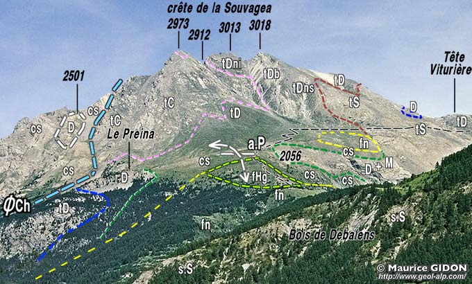 On traverse cette succession de couches, affleurant presque en dalles structurales, dans les pentes qui s'élèvent au dessus du village de Fouillouse , le long du sentier qui mène au refuge de Chambeyron : il s'élève d'abord en lacets dans l'enveloppe de flysch noir de l'anticlinal des Passets (que coiffe une petite klippe de flysch gréseux de l'Embrunais) puis il traverse la série, dans le sens stratigraphiquement descendant, en parcourant le versant en diagonale. à la faveur du fait que le pendage des couches y est notablement plus fort que l'inclinaison de la surface topographique (les couches les plus anciennes sont celles qui affleurent le plus haut sur la pente) |