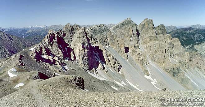 Vue d'ensemble du chaînon du Brec, Le Brec lui-même , La crête méridionale du Brec , La dépression des lacs de Chambeyron , l'Aiguille de Chambeyron , Fouillouse et La Souvagea.