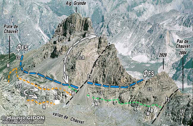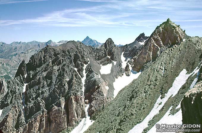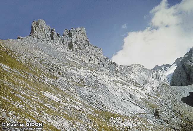 En fait il s'avère que cette klippe est logée dans un repli synclinal qui fait suite du côté nord à l'anticlinal de l'Aiguille de Chillol (voir la page "Aiguille de Chambeyron") et qu'elle est affectée par une cassure extensive transversale à la crête.