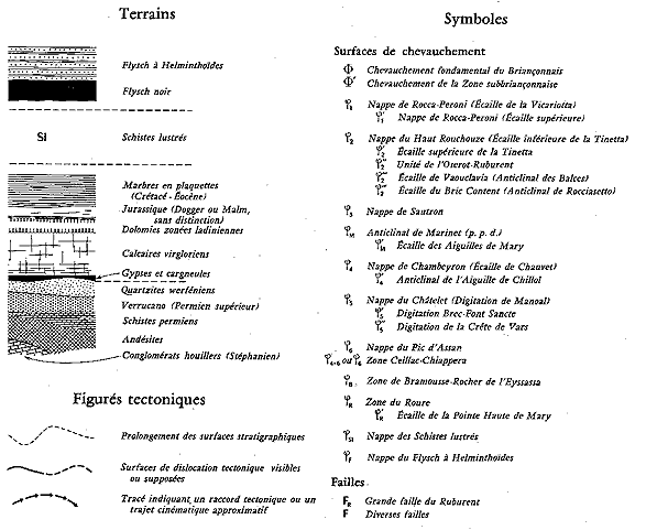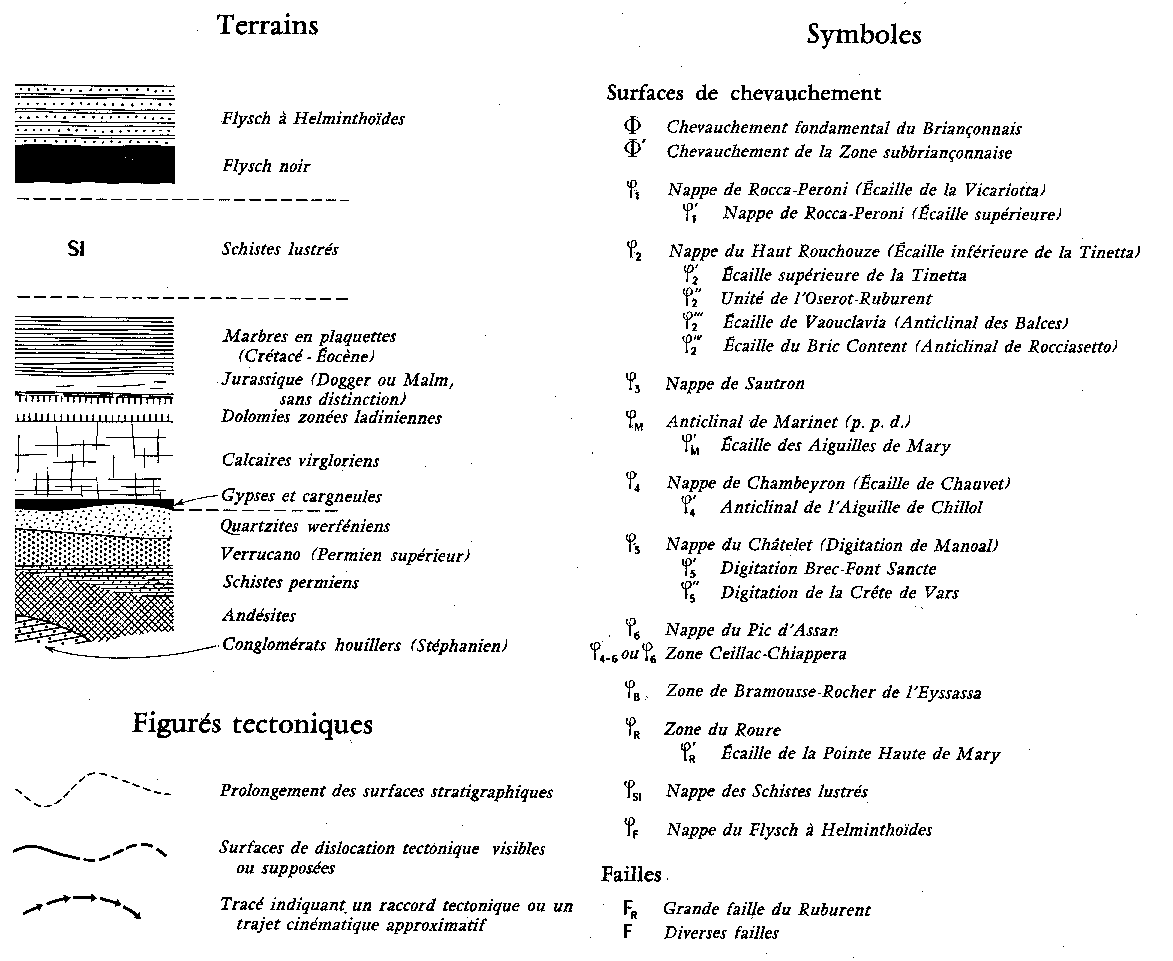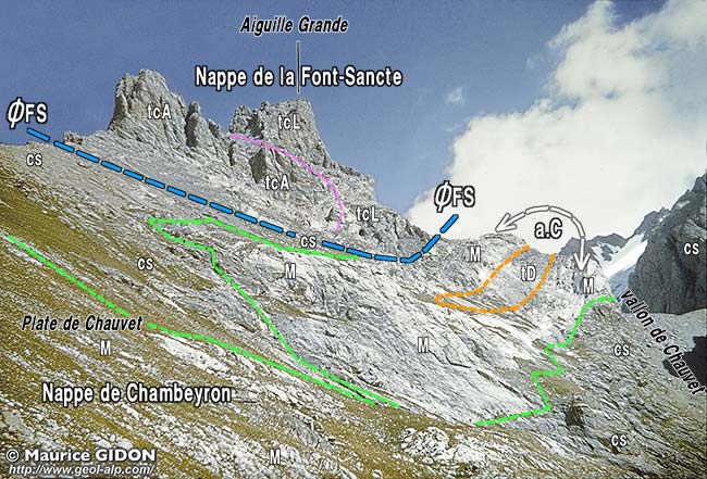 ØFS (bleu foncé) = surface de base de la nappe de la Font-Sancte. n.aC = nappe des Aiguilles de Chambeyron (unité de Chauvet = corps principal de la nappe) ; u.sR = unité du Sommet Rouge (digitation inférieure de la nappe des Aiguilles de Chambeyron) ; f.H = faille des Houerts : elle recoupe en biseau la surface de charriage de l'unité de Chauvet ; a.aC = anticlinal de l'Aiguille de Chillol. |