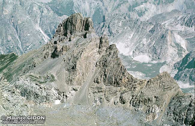 Plus bas la crête est couronnée par l'Aiguille Grande qui est une puissante tour ruiniforme, entièrement formée de calcaires dolomitiques du Trias moyen.