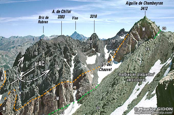 Le versant occidental de la crête secondaire qui se détache du sommet de l'Aiguille de Chambeyron en direction de l'Aiguille Grande coupe en biais le plus important de ces plis, l'anticlinal de l'Aiguille de Chillol. Cela permet de voir qu'il a un plan axial presque vertical, légèrement déversé vers le SE et un axe qui plonge vers le NW selon une inclinaison proche de celle de la ligne de crête.