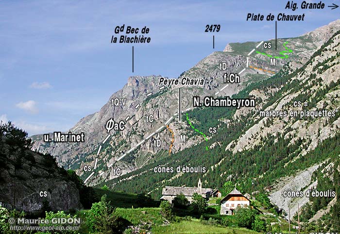 L'examen à distance des pentes qui s'élèvent, en rive gauche de l'Ubaye, vers la Plate de Chauvet permet de voir, dans les bosses boisées inférieures (rochers de Peyre Chavia, non dénommés sur la carte topographique), que les marbres du Malm y reposent en discordance angulaire sur les dolomies zonées du Trias moyen (Ladinien) (voir localisation sur le cliché et détails sur le schéma ci-après).