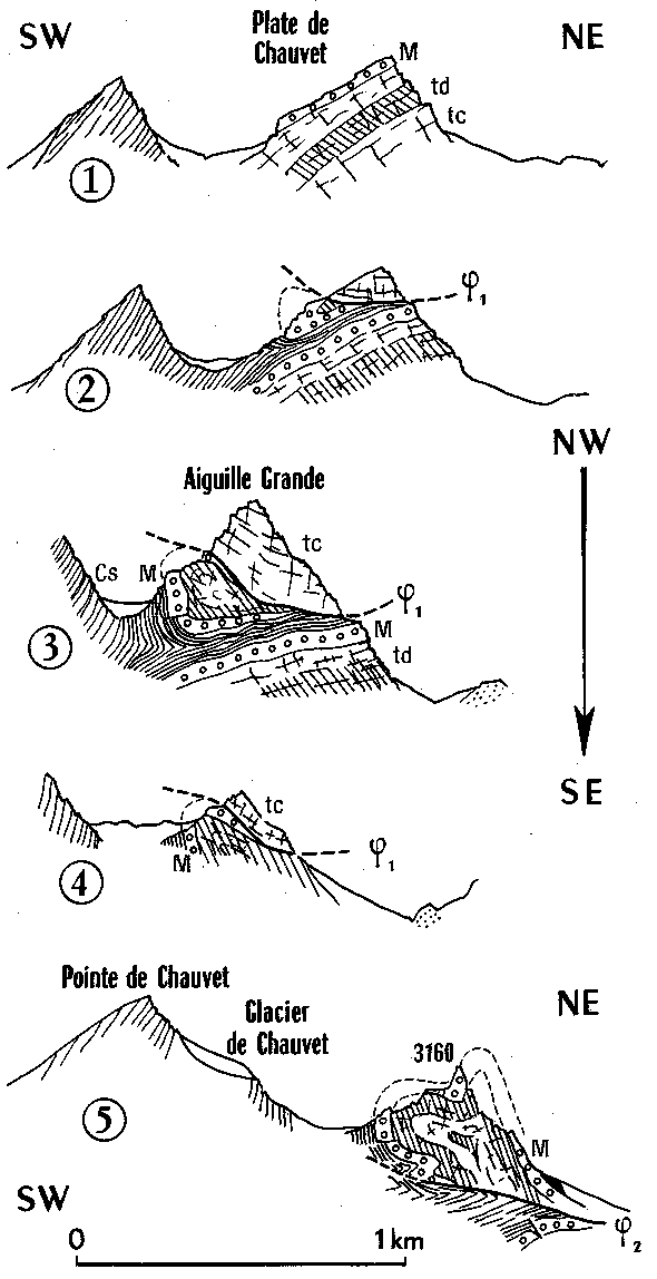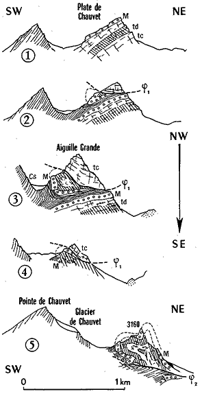 Coupes successives, du nord-ouest (1) vers le sud-est (5), au travers du vallon de Chauvet et de la crête de l'Aiguille Grande.