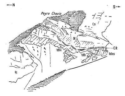 Discordance angulaire du Malm sur le Ladinien, aux rochers de Peyre Chavia (localisation ci-dessus), vue depuis la route D.25 en amont du Pont-Voûté. CR. = couches rouges de la base du Malm à faciès Marbre de Guillestre ; tdns, tdb, tdni = les 3 niveaux de dolomies successivement noires, blanches et noires du Ladinien. |