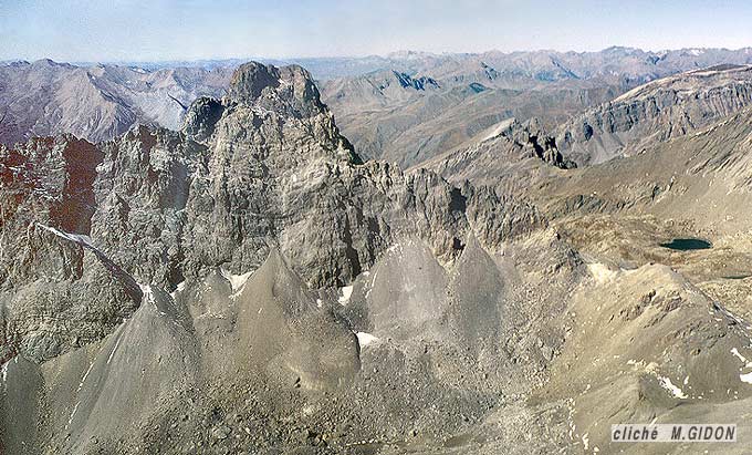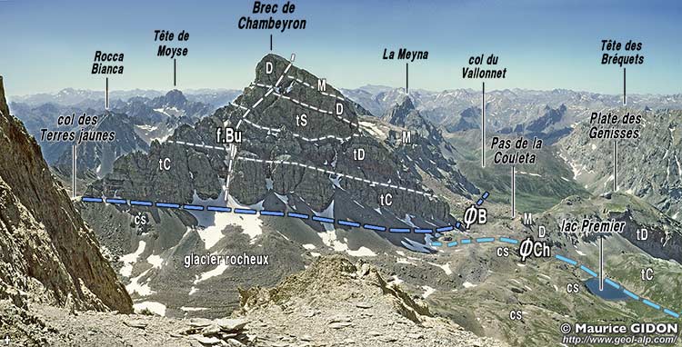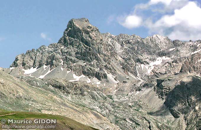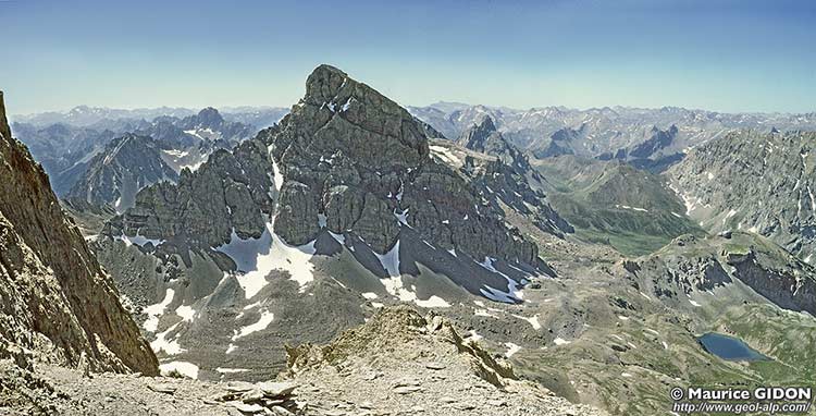 Toutes ces couches sont inclinées vers le sud-ouest ; elles déterminent des abrupts, tourmentés de couloirs et de clochetons, qui contrastent fortement avec le relief, mamelonné et garni d'alluvions quaternaires, du plateau des lacs de Chambeyron, formé quant à lui de calcschistes du Crétacé supérieur ("marbres en plaquettes").