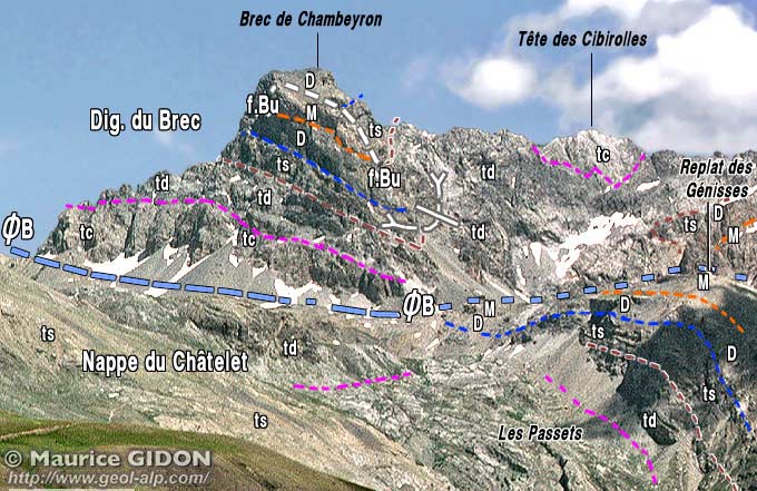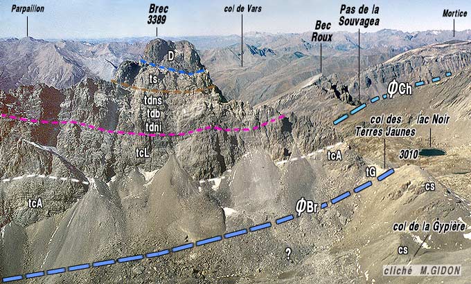 La superposition de ces deux ensembles est évidente puisque la ligne de séparation fait le tour de la montagne, bien qu'elle soit cachée par une jupe d'éboulis presque continue (notamment sur le versant italien). Elle est en outre clairement anormale puisque des terrains relativement anciens surplombent d'autres plus récents. Elle se fait selon une surface presque plane, doucement pentée vers l'ouest, de superposition tectonique qui isole du chaînon du Brec en une klippe.