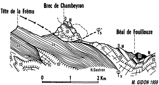 ![]() Coupe transversale au vallon de Fouillouse, passant par le sommet du Brec. (le sud-ouest est à droite, conformément à l'orientation du cliché ci-dessus). Ø5 = chevauchement de la nappe du Châtelet , Ø'5 = chevauchement de la "digitation" du Brec. |