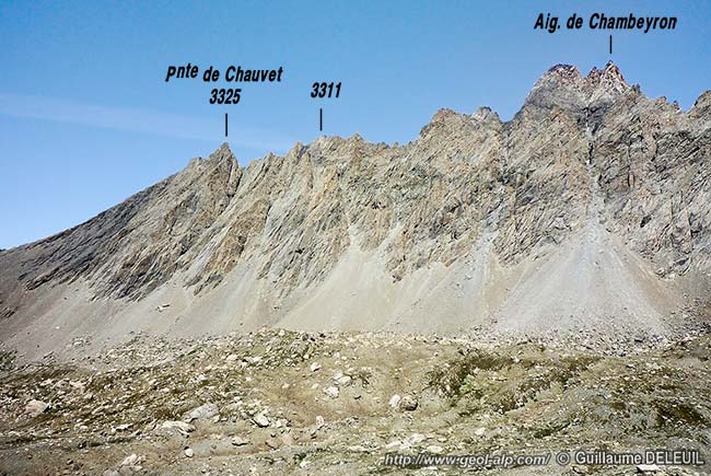 Au nord-ouest du sommet de l'Aiguille de Chambeyron le vallon de Chauvet détache de la crête principale celle de l'Aiguille Grande, qui s'abaisse vers la gorge de l'Ubaye en rive gauche du vallon de Chillol. Cette dernière porte également une klippe de calcaires triasiques (voir la page "Aiguille Grande"). Le fait que, dans cette partie de la montagne, les calcschistes de la nappe de Chambeyron supportent plusieurs lambeaux de calcaires triasiques montre que la nappe de Chambeyron a été chevauchée par une unité supérieure qu'il est donc loisible, en fait, d'attribuer soit à la nappe du Châtelet soit à celle de la Font-Sancte.