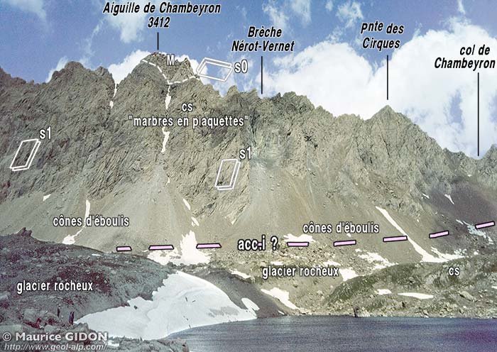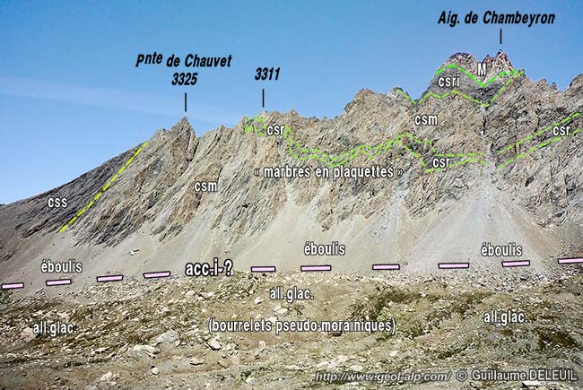 L'arête ouest de l'Aiguille de Chambeyron, vue du sud depuis la rive du Lac des Neuf-Couleurs.(cliché original obligeamment communiqué par M. G. Deleuil) csri = calcschistes rouges inférieurs ; csm = calcschistes moyens (csr = calcschistes rouges intermédiaires) ; css = calcschistes argileux sombres supérieur. acc.i? = tracé masqué (supposé) de l'accident de l'Infernetto (voir la page "Infernetto"). |
