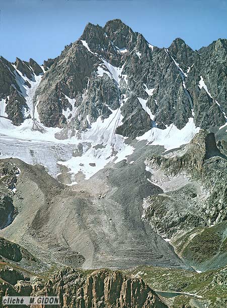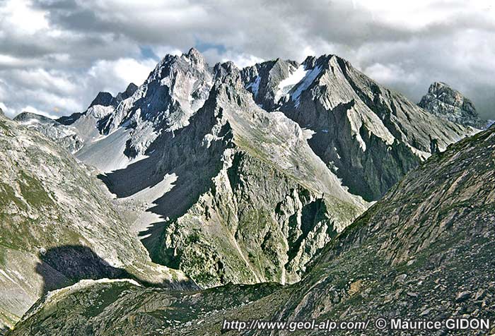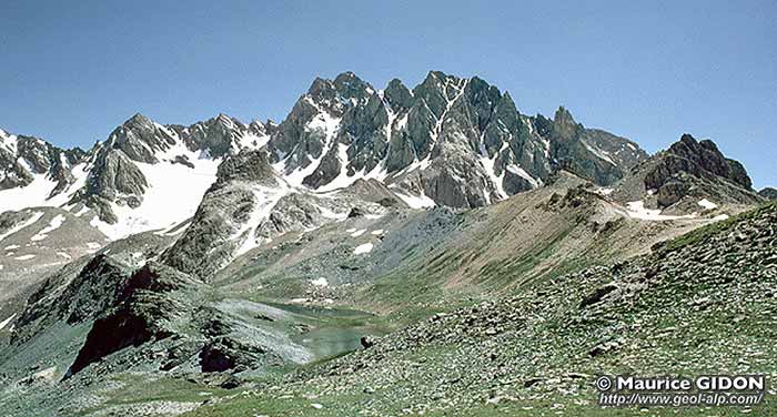 Au pied de cette face nord le matériel calcaire de la nappe des Aiguilles de Chambeyron y repose sur le matériel siliceux de l'unité de Marinet par une surface tectonique que l'on peut en première analyse considérer comme sa surface de charriage.