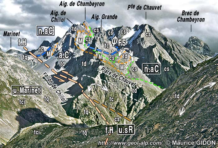 Mais, à l'aplomb du sommet, cette surface recoupe en biseau très oblique le cœur de l'anticlinal de Chillol aussi bien que la klippe de Trias calcaire qui repose sur le flanc nord-oriental de l'anticlinal de l'Aiguille de Chillol. De plus on voit, plus bas dans le vallon de Chillol qu'elle recoupe la surface de redoublement tectonique qui y individualise une digitation inférieure (l'unité de du Sommet Rouge) : il assez donc plausible que ce "contact basal" sur l'unité de Marinet soit plutôt (ici au moins) le prolongement de la faille des Houerts, faille tardive qui détermine, en rive droite de l'Ubaye, le col du même nom.