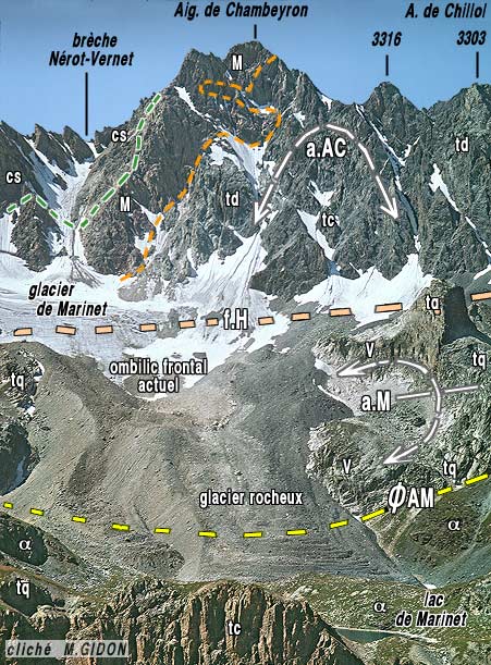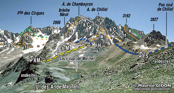 a.M = anticlinal de Marinet ; a.C = anticlinal de l'Aiguille de Chillol (son axe, incliné vers la droite est tordu d'une concavité orientée vers l'observateur) ; f.H = faille des Houerts (anciennement considérée comme surface de chevauchement de la nappe des Aiguilles de Chambeyron) ; ØFS = surface de chevauchement de l'unité de la Font-Sancte (en bleu) ; ØAM = surface de chevauchement de l'écaille des andésites de Marinet . Ces andésites reposent sur les quartzites du rocher 2906, par l'intermédiaire du chevauchement de l'écaille des andésites de Marinet, qui est enroulé par l'anticlinal de Marinet. Elles sont coiffées, à l'Aiguille 2827, par une klippe* de calcaires triasiques, qu'il faut sans doute rapporter à la nappe de la Font-Sancte (voir la page "Chillol"). Une autre klippe de Trias calcaire repose sur le flanc oriental de l'anticlinal de l'Aiguille de Chillol (où elle est séparé du Malm par un peu de marbres en plaquettes). Elle forme la butte au sud-ouest du col 2831, qui sépare la dépression des glaciers de Marinet du vallon de Chillol. |