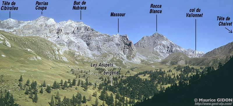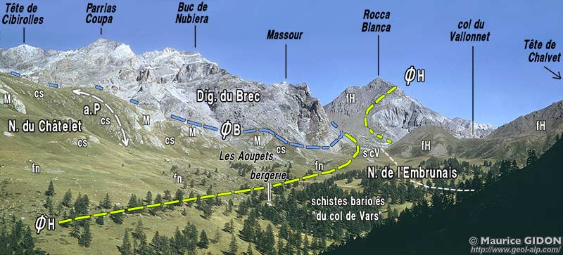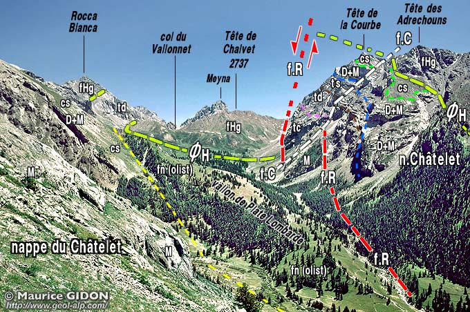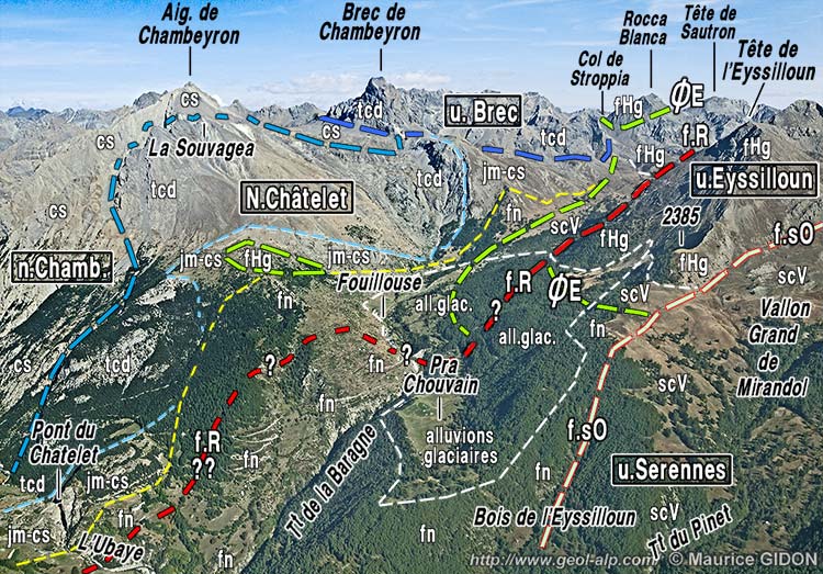 La disposition est bien celle d'un flanc de synclinal à relief presque conforme*, car les termes plus anciens du matériel de cette nappe du Châtelet affleurent dans les pentes qui dominent le village du côté nord-est (notamment le long du sentier des lacs de Chambeyron) avec des pendages grossièrement parallèles à la pente topographique. Toutefois, ce pendage des couches y étant un peu plus fort que l'inclinaison finale de la surface topographique créée par l'érosion, les couches les plus anciennes sont celles qui affleurent le plus haut sur la pente (voir la page "Souvagea").