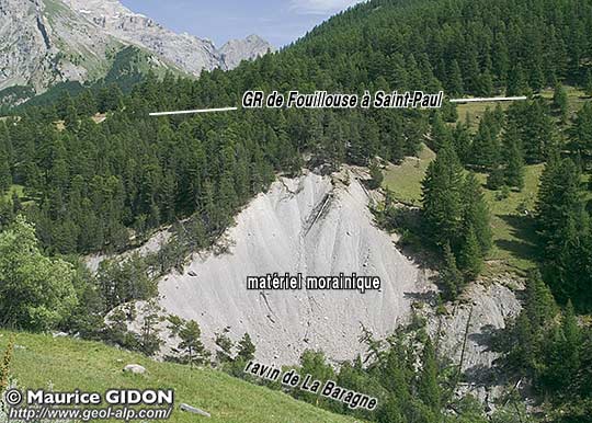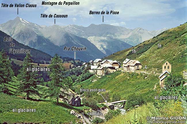 Ce replat, anciennement cultivé mais maintenant essentiellement garni de prés de fauche, correspond au sommet d'un ancien colmatage de la vallée de l'Ubaye par des matériaux fluvio-glaciaires (lors de la dernière glaciation, du Würm) ; il culmine aux environs de 1900 m. (en amont des dernières maisons) et ses matériaux constitutifs s'observent, en contrebas du village, notamment au niveau du parking, dans l'entaille, qui s'est actuellement ré-activée, du torrent de La Baragne.