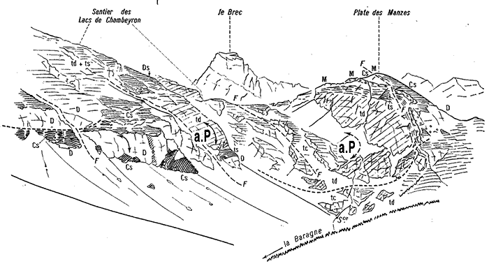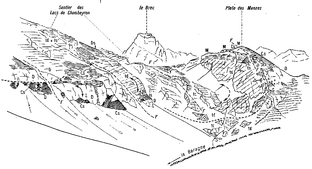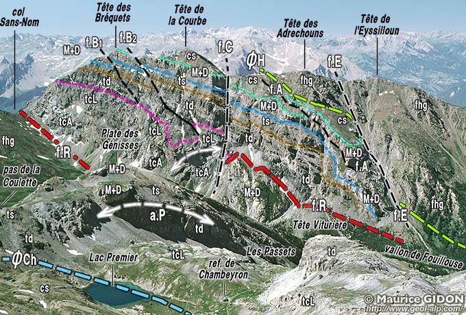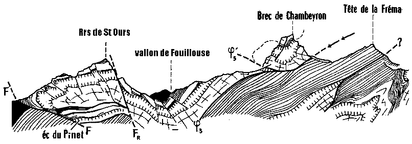 C/ La faille du Ruburent s'avère être une cassure majeure, par son rejet de l'ordre de 800 m aux Rochers de Saint-Ours, mais aussi par le fait qu'on la suit longuement et sans difficulté en direction du sud-est, par le vallon du Pinet puis celui du Rouchouse, jusque aux lacs du Ruburent.