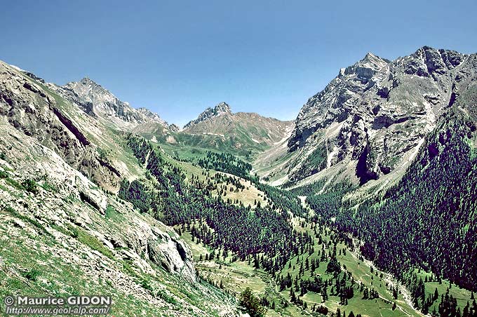 La partie haute du vallon de Plate-Lombarde (versant nord-oriental), vue du nord-ouest, depuis le ravin des Baumes, au pied des Rochers de Saint-Ours. |