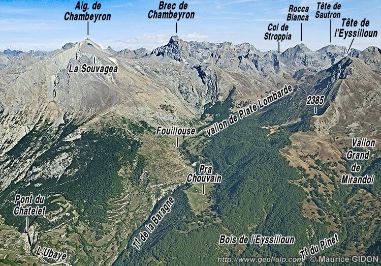 B/ Le vallon de Plate Lombarde qui s'ouvre en amont de Fouillouse doit clairement son existence à la structure tectonique de ce secteur. En effet il correspond à une dépression fondamentalement synclinale (le synclinal de Fouillouse") puisqu'elle héberge du matériel rocheux relativement récent par rapport à celui de ses bordures (voir la coupe en fin de page). Il s'agit du flysch noir briançonnais, c'est-à-dire la partie haute de la succession stratigraphique de la nappe du Châtelet, qui y est recouvert par des argilites de la formation basale de la nappe du flysch à Helminthoïdes. Ces deux termes constituant l'un comme l'autre un matériel relativement tendre l'érosion a creusé le vallon en les déblayant assez largement.