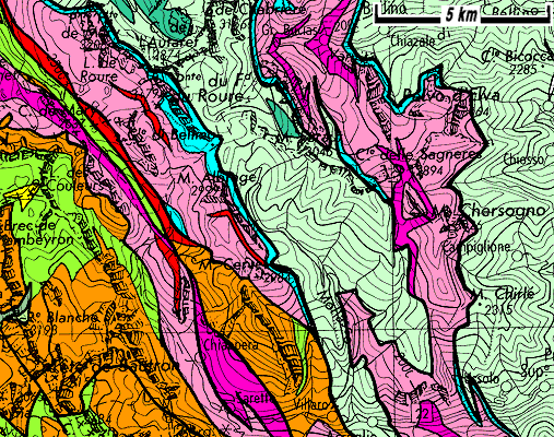 h5 = grès et conglomérats houillers ; ra = andésites ; rA = conglomérats permiens ; rt = Verrucano , tiQ = quartzites werféniens ; tiK = cargneules ; tmC = calcaires aniso-ladiniens ; tmD = dolomies ladiniennes ; js = Marbres du Malm ; c-e = calcschistes néo-crétacés ; js-c = marbres du Malm et du Néocrétacé ; cB = calcschistes à brèches de l'Alpet ; dB = ophicalcites |