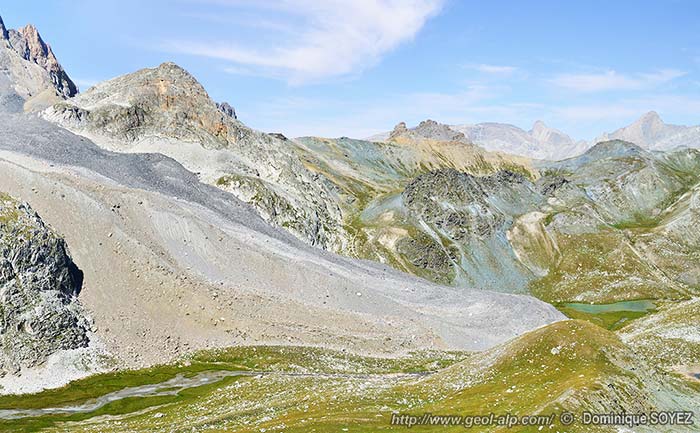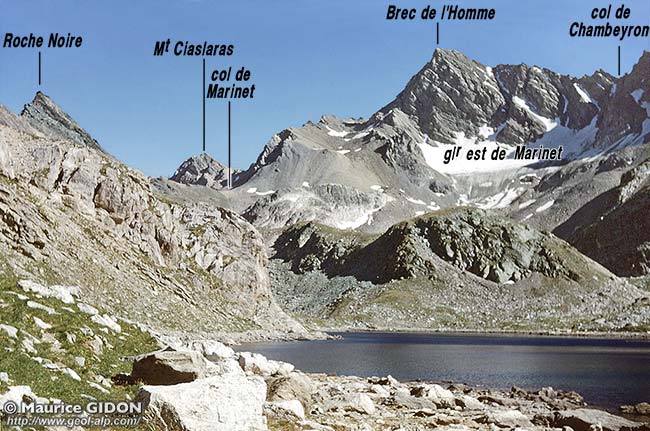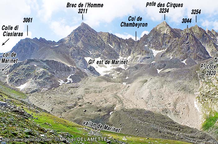 Du point de vue du relief et des formations quaternaires il est remarquable que versant nord du chaînon de l'Aiguille de Chambeyron héberge deux petits glaciers de cirque (sans doute les plus méridionaux des alpes), mais qui sont hélas agonisants. Leurs moraines se sont transformées en glaciers rocheux* qui s'avancent de façon très spectaculaire jusqu'au fond du vallon de Marinet. Ce sont eux d'ailleurs qui cachent en très grande partie les contacts tectoniques qui courent le long de ce pied de versant.