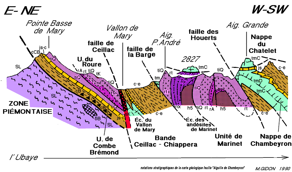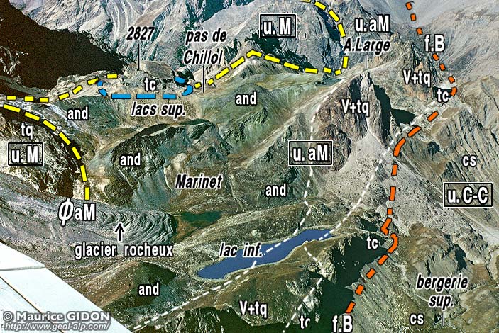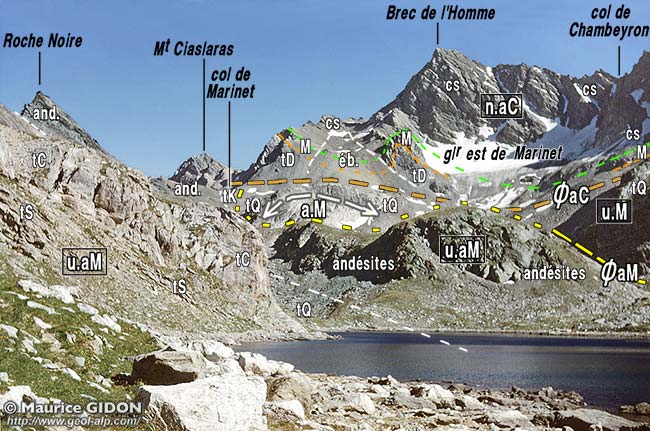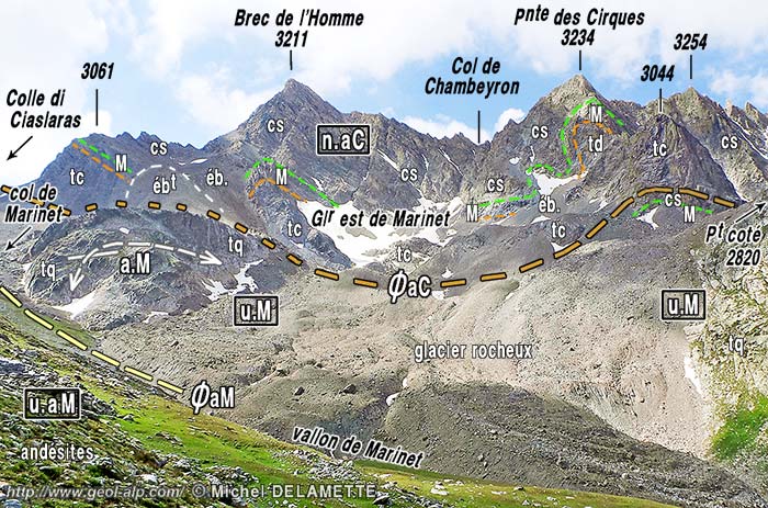 ![]() La crête orientale de l'Aiguille de Chambeyron, vue des abords du refuge-bivouac du Lac de Marinet. ØaC = surface de chevauchement de la nappe de l'Aiguille de Chambeyron ; a.M = anticlinal de Marinet (au bord droit du cliché on voit seulement les quartzites de son flanc NE, qui plongent vers le fond du vallon de Marinet depuis la bosse 2820) ; u.M = unité de Marinet proprement dite ; ØaM = surface de chevauchement de l'unité des andésites de Marinet (elle est renversée par suite du ploiement par l'anticlinal de Marinet). En face nord du Brec de l'Homme et sur l'arête nord de la Pointe des Cirques la barre des calcaires du Malm est redressée aux abords de la verticale car elle appartient (comme au sommet de l'Aiguille de Chambeyron) au flanc nord du synclinal du Brec de l'Homme (voir la page "Infernetto". |