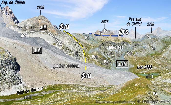 En fait on peut constater au nord des lacs que la décapitation de la voûte de quartzites de l'anticlinal de Marinet ne relève pas de la simple érosion quaternaire. C'est ce qu'indique la présence, juste au dessus des lacs supérieurs de Marinet, d'une klippe* de dolomies triasiques (aiguille 2827) qui repose sur les roches volcaniques permiennes du coeur du pli avec une forte discordance angulaire. Elle montre que cette voûte anticlinale avait été tronquée, par un processus d'ailleurs à préciser, avant la fin des mouvements tectoniques (voir la coupe en fin de page). C'est en tous cas après cette arasion qu'ont dû se produire les ultimes déplacements des nappes de charriage et notamment de la nappe de la Font-Sancte à laquelle tout indique que cette klippe est attribuable (voir la page "Chillol"). |