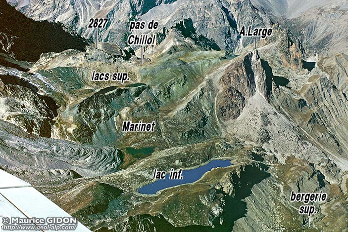 Du côté sud-occidental, la dépression des lacs de Marinet est dominée par le chaînon de l'aiguille de Chambeyron qui est essentiellement constitué par les couches calcaires : elle appartiennent à la nappe de Chambeyron et sont séparées du matériel essentiellement siliceux de la dépression par une jupe d'éboulis : il es donc à présumer que celle-ci cache la surface de charriage de cette nappe.