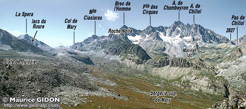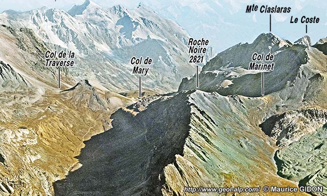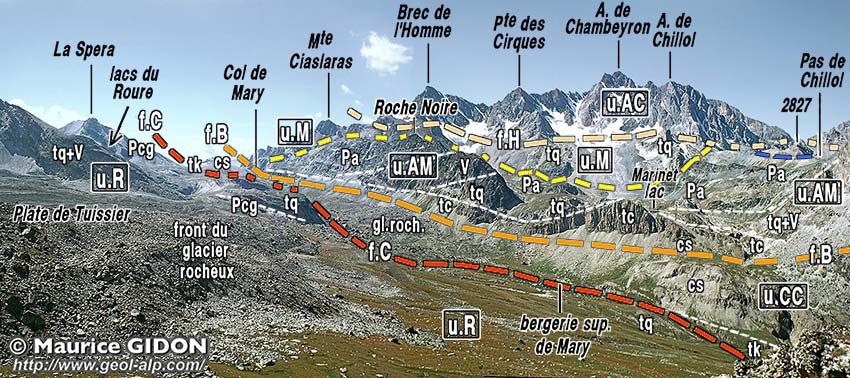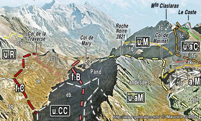 ![]() Le versant français du Col de Mary, vu du NW d'avion, depuis l'aplomb du Lac de Marinet. u.R = unité du Roure (voir la page "Pointes de Mary") ; u.CC = unité des calcschistes de Ceillac-Chiapera ; u.aM = unité des Aiguilles et andésites de Marinet ; u.M = unité de Marinet ; a.M = voûte de quartzites de l'anticlinal de Marinet ; n.aC = nappe de Chambeyron. |