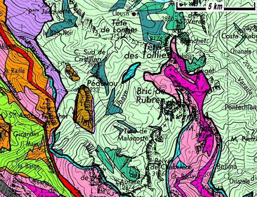 notations de la carte géologique au 1/50.000° : h5 = grès et conglomérats houillers ; ra = andésites ; rA = conglomérats permiens ; rt = Verrucano , tiQ = quartzites werféniens ; tiK = cargneules ; tmC = calcaires aniso-ladiniens ; tmD = dolomies ladiniennes ; js = Marbres du Malm ; c-e = calcschistes néo-crétacés ; js-c = marbres du Malm et du Néocrétacé ; cB = calcschistes à brèches de l'Alpet ; dB = ophicalcites. |