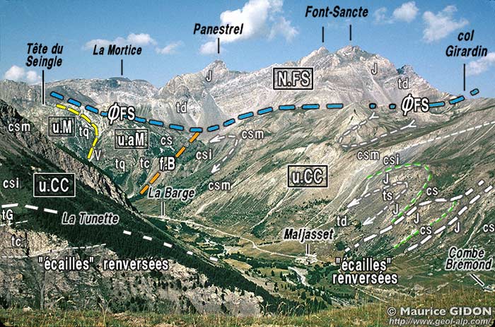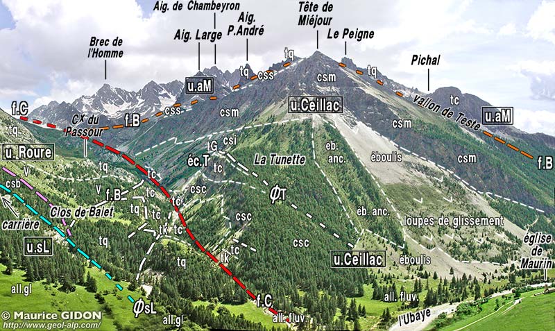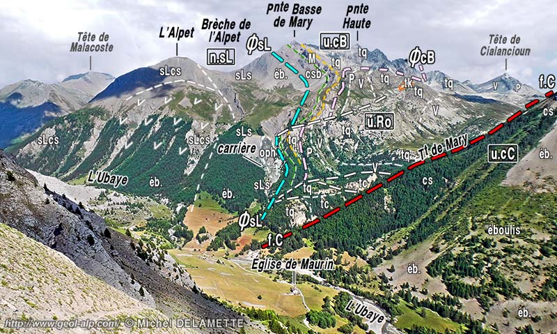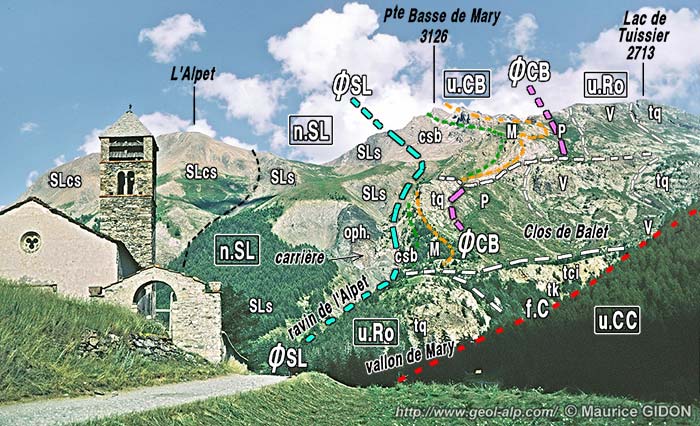 f.C = faille de Ceillac ; ØCB = surface de charriage de l'unité de Combe Brémond ; ØSL = surface de charriage de la nappe des Schistes lustrés. csb = calcschistes à brèches de l'Alpet ; M = marbres du Malm et du Crétacé supérieur, reposant stratigraphiquement sur les quartzites de l'unité de Combe-Brémond. Cette vue souffre d'une perspective en contre plongée qui ne permet pas une vue correcte des hautes pentes (la Pointe Haute de Mary et notamment cachée derrière l'épaule de Tuissier : pour ces hautes pentes se reporter à la page "Pointes de Mary"). |