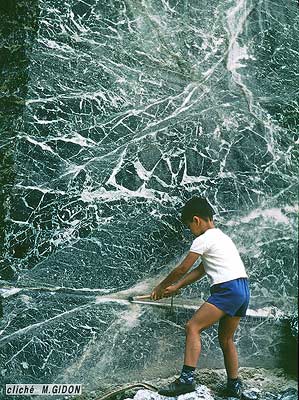 Le front de taille (abandonné) de la carrière de marbre de Maurin. On distingue bien la structure de l'ophicalcite : c'est une brèche tectonique à éléments de serpentinite dont les filons de calcite remplissent les espaces formés par la fragmentation de la roche. Le front de taille, vertical, porte des stries presque horizontales, ici légèrement inclinées vers la droite (le fer du marteau est appuyé sur l'une d'entre elles). Ce sont les traces de passage du fil abrasif qui servait de scie pour débiter la roche. On trouvera des données complémentaires sur l'ancienne exploitation de ce marbre et son emploi ornemental à cette adresse. |