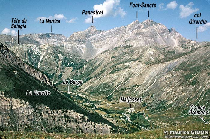 Les affleurements de ces derniers prolongent sans problème ceux qui forment, en rive opposée, la Tête de Girardin, ce qui les rattache aussi à l'unité de Ceillac**. Mais la structure plissée de la rive droite ne se reconnait pas ici, peut-être simplement à cause de l'importante couverture d'éboulis qui masque le soubassement rocheux du versant jusque très haut : celle-ci s'étend en effet sur une grande largeur là où devraient se prolonger les plis qui affectent, en rive droite de l'Ubaye, les terrains triasiques et jurassiques du bas versant, au niveau du village de Maljasset.