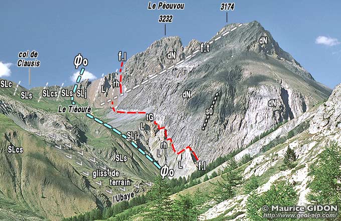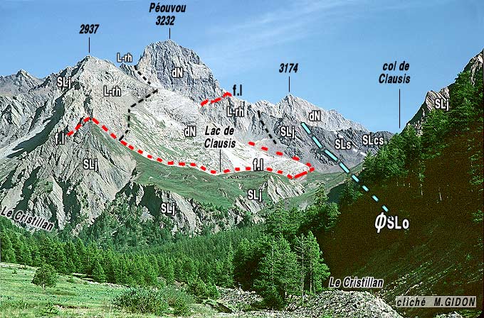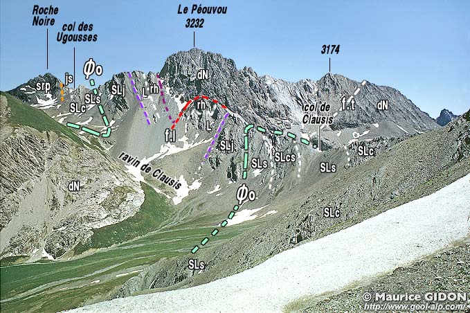 En définitive le chaînon du Péouvou a donc globalement la forme d'une énorme amande, à coeur de dolomies noriennes, fichée presque verticalement au milieu des schistes lustrés. Cette amande de dolomies est flanquée, à l'est comme à l'ouest, par des schistes lustrés "continentaux" disposées de façon symétrique et avec une polarité opposée, ce qui évoque une disposition anticlinale.