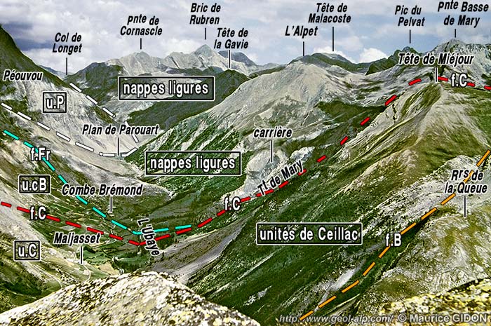 Sur deux kilomètres en amont de Combe-Brémond (voir la page "Maurin") les basses pentes de rive droite de la vallée de l'Ubaye, où passe le chemin qui la remonte, sont constituées par deux échines pierreuses formées de matériel disloqué qui n'est clairement pas de la roche en place. Puis en amont de ce passage la vallée retrouvre brièvement un fond alluvial franchement plat, le Plan de Parouart. C'est un plan alluvial typique, comalté de limons fluviatiles : il correspond en fait à un ancien lac qui n'a fini de se combler qu'à la fin du XIXème siècle (comme en témoignent d'anciens documents).