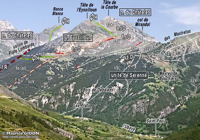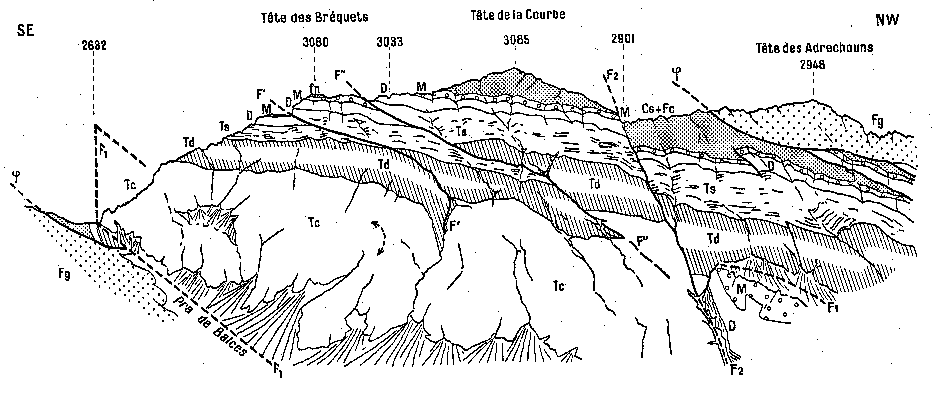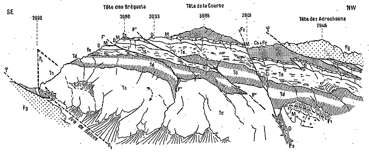 La partie plus occidentale des abrupts de la Tête des Bréquets, masquée par la Tête de Roir Alp, est visible à la page "Saint-Ours". u.E = unité de l'Eyssilloun ; NCh = nappe du Châtelet ; éc.s, éc.m et éc.i = écailles du Pinet supérieure, moyenne et inférieure (= nappe de Sautron) ; u.tD = unité de Tête Dure (nappe du Rouchouse occidentale) ; n.S = nappe de Sautron. f.Ru = faille du Ruburent. f.r et f.r' = "failles longitudinales de la Courbe"(= F2 et F3 du croquis du versant nord-ouest des Rochers de Saint- Ours) ; ce sont des failles extensives apparemment greffées sur la faille du Ruburent (failles de Riedel ?). La faille du Pinet (f.P.) est, en très large part, masquée par la Tête de Roir Alp. a.Ro = anticlinal du Haut Rouchouse ; s.F = synclinal de Fouillouse. (voir la suite du paysage, vers la droite, à la page "Rocca Blanca") |