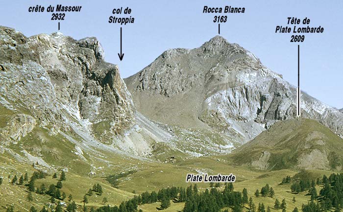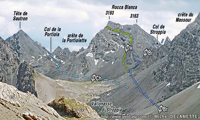 Sur le versant italien les forts abrupts qui tombent sur le vallonasso de Stroppia montrent une disposition symétrique de celle du côté Vallonnet. Toutefois, la coupe naturelle étant orientée parallèlement à l'axe de l'anticlinal de la Portiolette aucune des complications associées à ce pli n'y est visible. Ce versant montre en outre que la surface de charriage de la nappe du Châtelet (masquée sous les éboulis) aboutit au Col de la Portiola et fait donc reposer cette dernière sur la nappe de Sautron. Plus au SE le matériel de la nappe du Châtelet n'affleure plus, enlevé par l'érosion à la faveur du plongement général vers le NW des structures (mais il est finalement vraisemblable que le front du chevauchement de cette nappe se trouvait guère au delà).